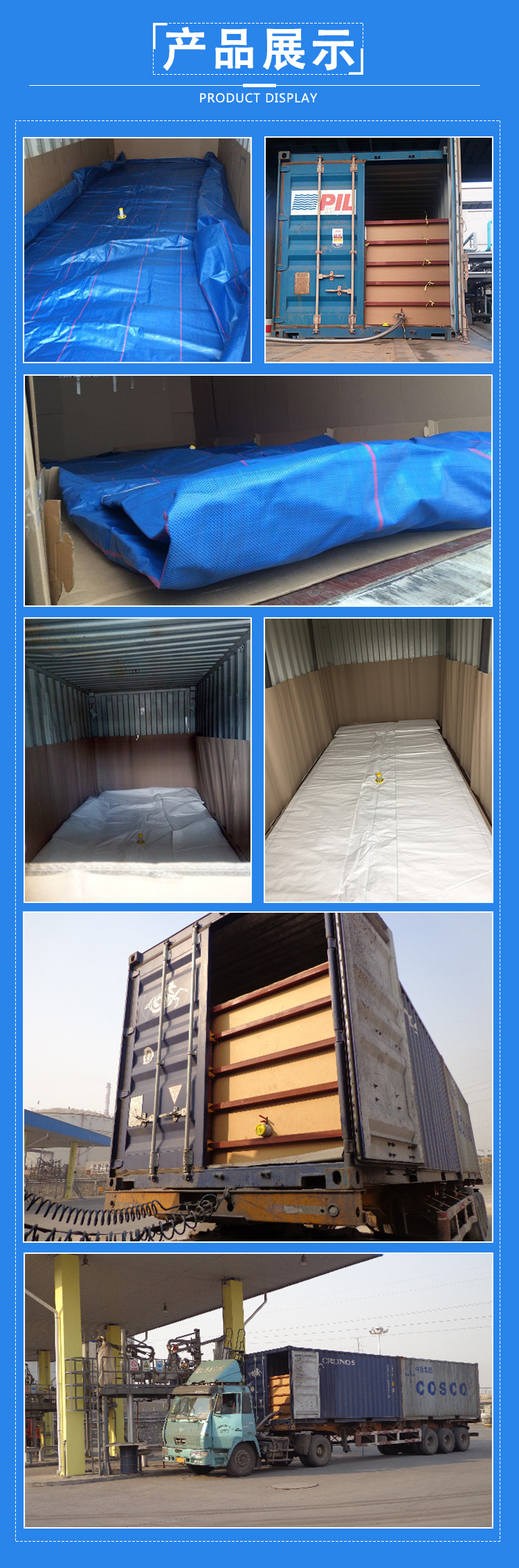高強度焊縫的聚氨酯液袋,焊縫經過雙面貼條加強,焊縫強度高于材料本身強度1.3倍,長4.3米寬2.3米高1.5米,適合用于13米半掛車,裝載煤焦油、棉籽油、花生油、減水 劑、助磨劑、造紙助劑等液體貨物的長途運輸,無需專業的罐車、槽車,空載配貨,節約運費一半以上,顛覆了傳統的運輸方式,引發非危險液體貨物長途運輸的一場革命。